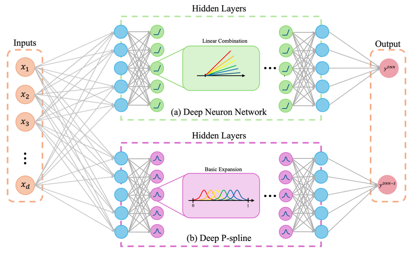 arXiv 2025 We introduce a difference penalty that automates knot selection, thereby simplifying the complexities of neuron selection. We name this method Deep P-Spline (DPS). This approach extends the class of models considered in conventional DNN modeling and forms the basis for a latent variable modeling framework using the Expectation-Conditional Maximization (ECM) algorithm for efficient network structure tuning with theoretical guarantees.